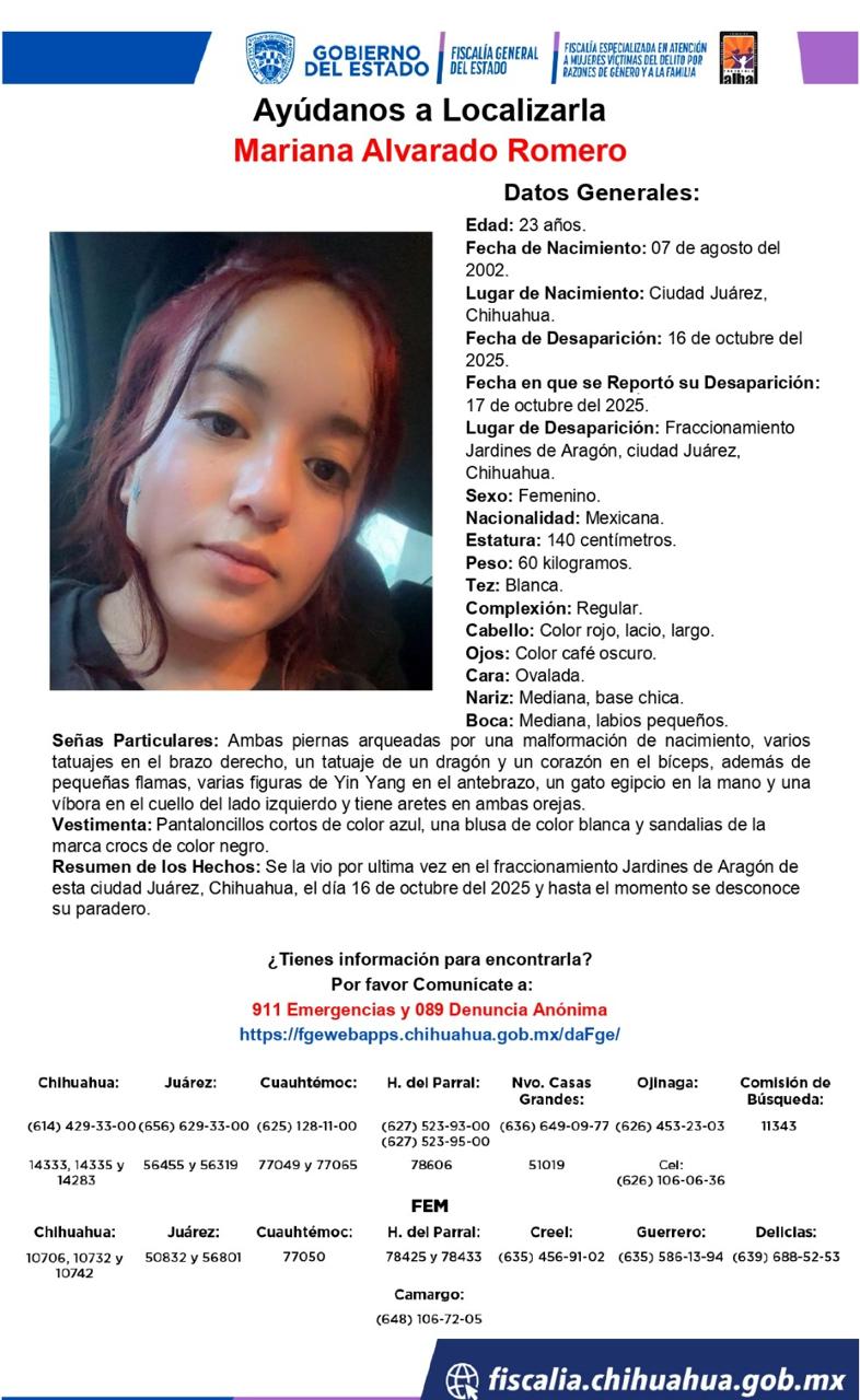 Ciudad Juárez, Chihuahua. — Autoridades y familiares de Mariana Alvarado Romero, de 23 años, solicitan la colaboración de la ciudadanía para localizar a la joven, quien fue vista
