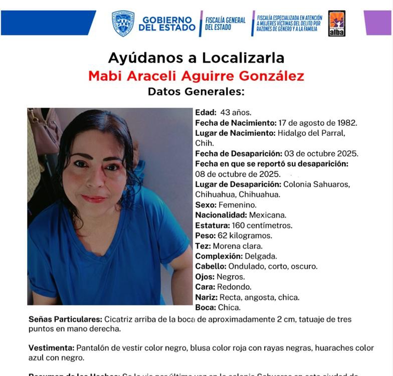 Mabi Araceli Aguirre González, de 43 años, desapareció el pasado 3 de octubre de 2025 en la colonia Sahuaros, en la ciudad de Chihuahua. Natural de Hidalgo del
