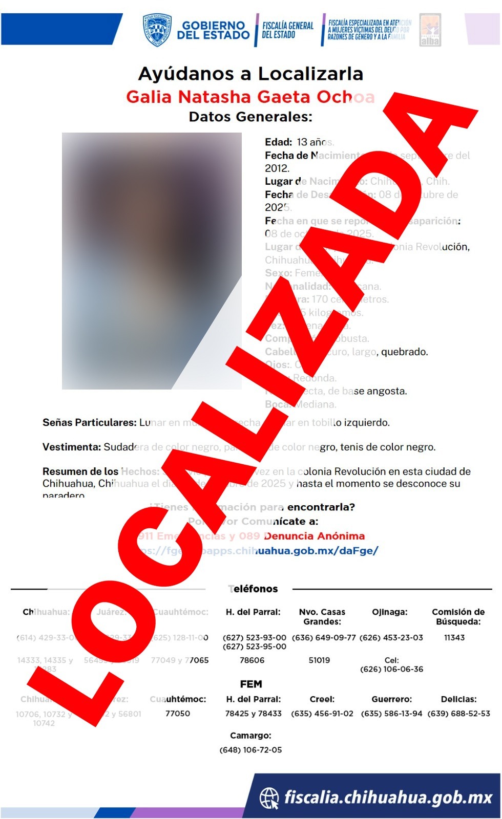 En seguimiento a la pronta activación del Protocolo Alba, elementos de la Agencia Estatal de Investigación localizaron sana y salva a la adolescente de iniciales G.N.G.O., horas después